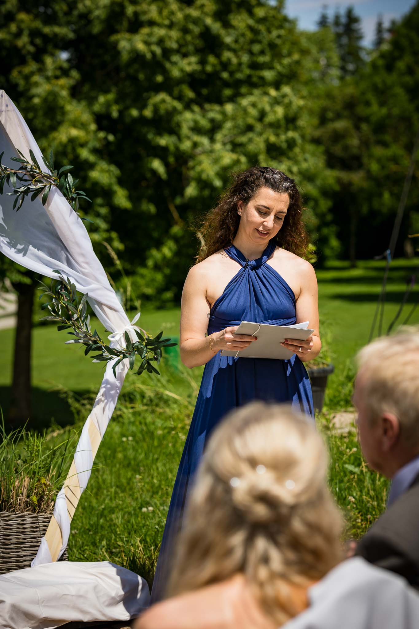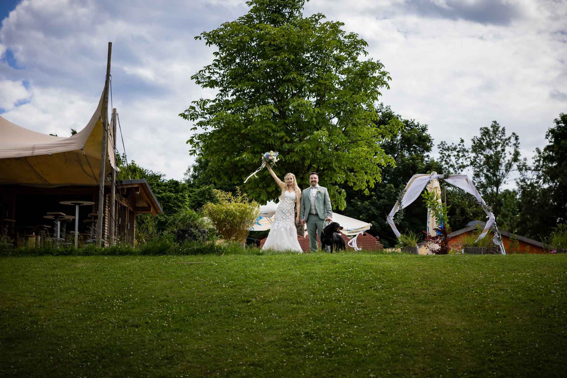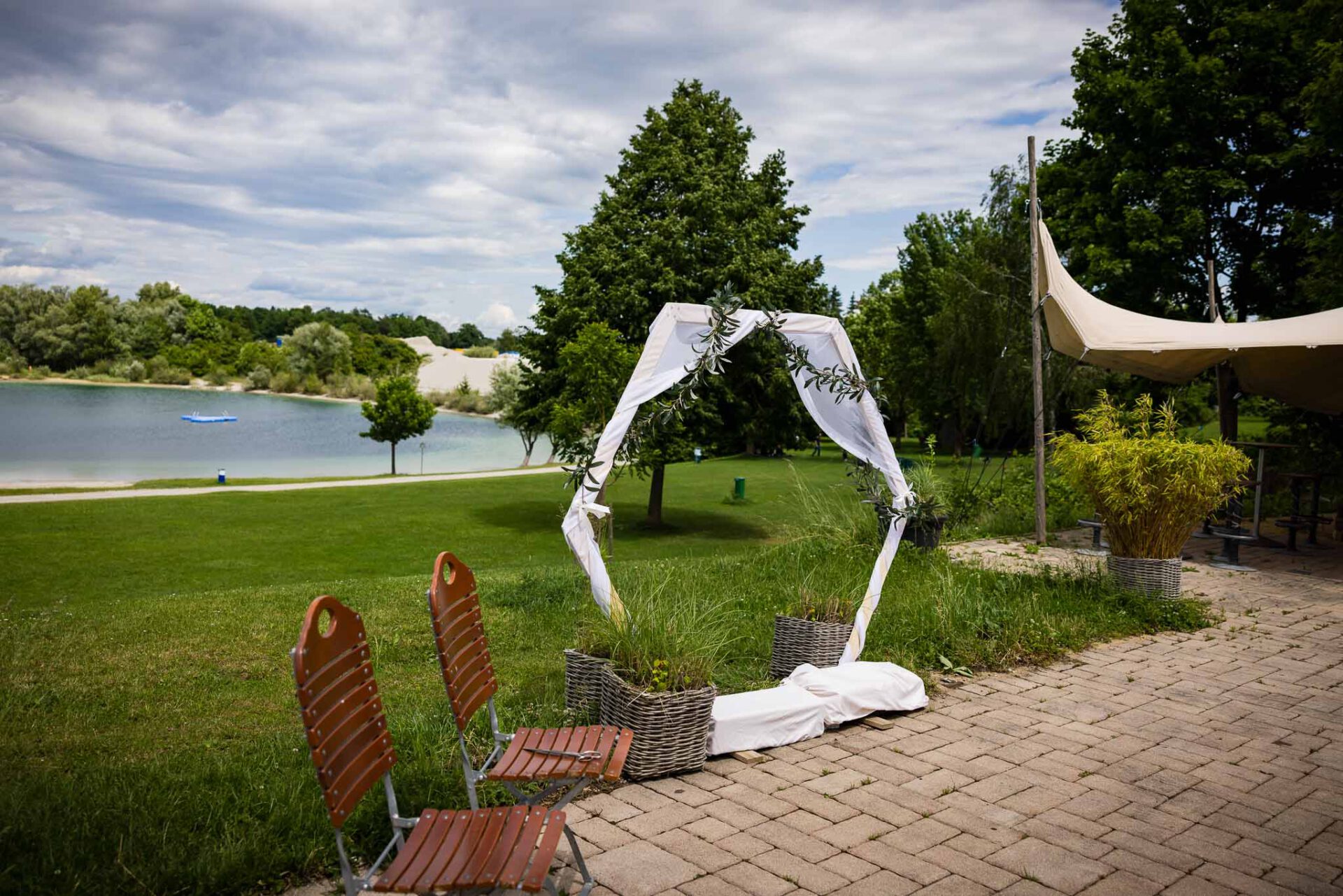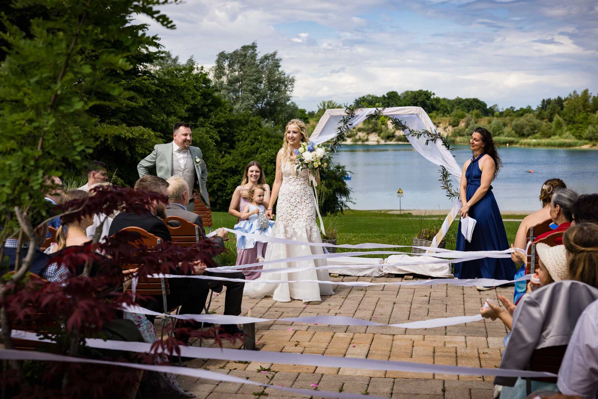 Die Zeremonie findet auf der großzügigen Terrasse statt, sodass ihr und eure Gäste einen offenen Blick über das Pucher Meer genießt. Felina und Dominik haben sich für einen wunderschönen Traubogen entschieden, der perfekt zur natürlichen Umgebung passte. Obwohl wir an diesem Tag mit 30 Grad und strahlendem Sonnenschein konfrontiert waren, haben wir als Hochzeitsfotografen Fürstenfeldbruck professionell reagiert. Denn genau solche wechselnden Lichtsituationen sind unsere Spezialität – und genau deshalb solltet ihr auf erfahrene Profis setzen.