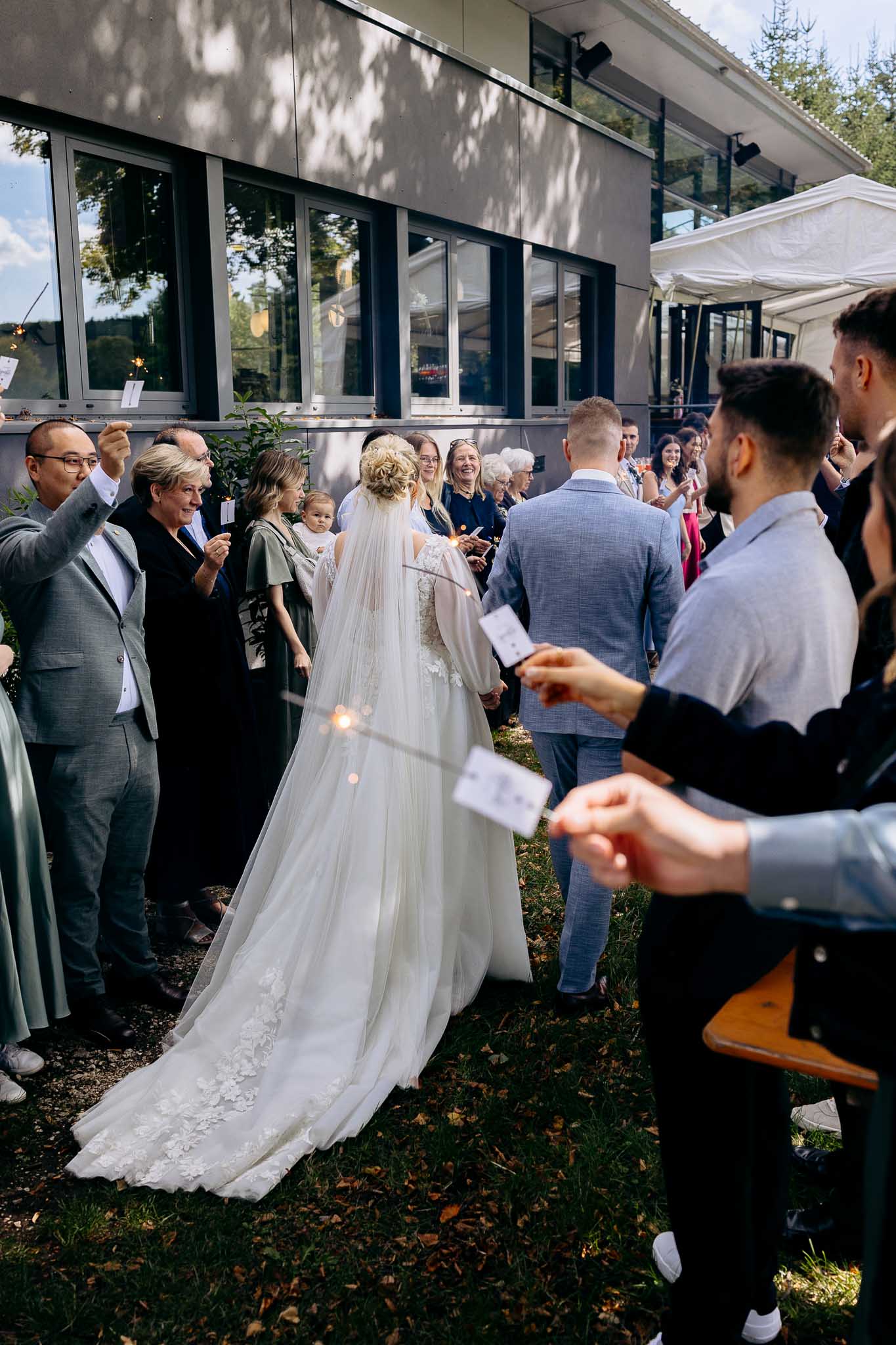 Nach der freien Trauung im Kiefernwald ging es für die Gäste zum Sektempfang auf der überdachten Terrasse. Währenddessen haben wir noch einige Bilder mit dem Brautpaar gemacht, denn die Gäste hatten ein wunderschönes Spalier mit Sternwerfern vorbereitet. Da wir im September feierten und das Wetter grandios war, hielten sich alle bis zum Abendessen im Außenbereich auf.