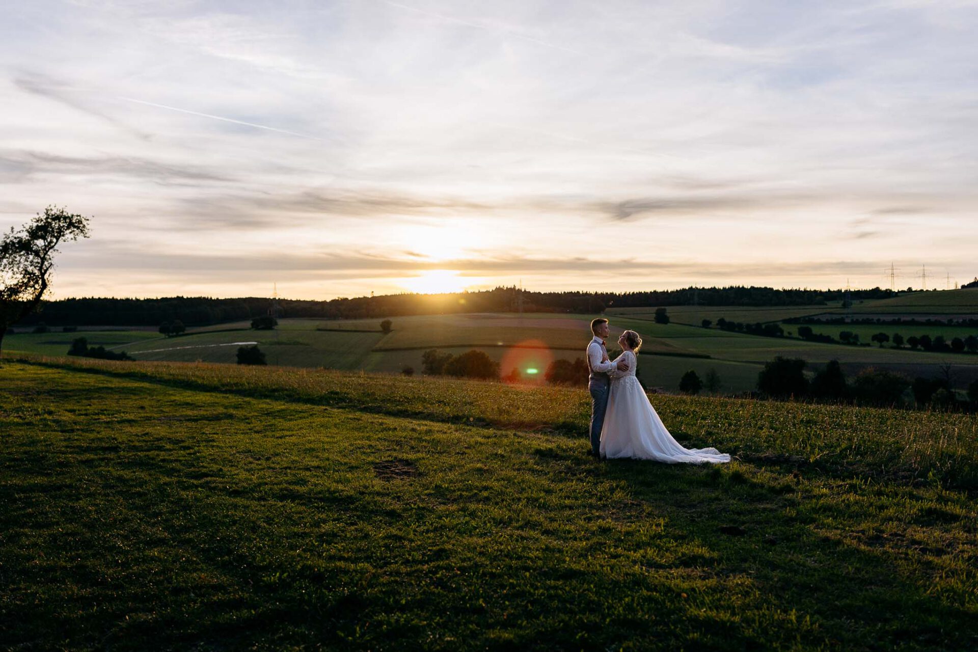 Als Hochzeitsfotograf Blaustein lieben wir Robos Waldblick besonders wegen der unendlich vielen Fotomöglichkeiten. Wir haben mit Anna-Lena und Tobias das Brautpaarshooting direkt im Kiefernwald gemacht – inklusive First Look. Doch das Highlight war eine Lichtung, nur 200 Meter vom Kiefernwald entfernt, mit einem grandiosen Weitblick über die komplette Landschaft. An diesem Tag hatten wir zudem das Glück, einen brutalen Sonnenuntergang zu erleben, der uns innerhalb von 15 Minuten die einzigartigsten Hochzeitsbilder bescherte.