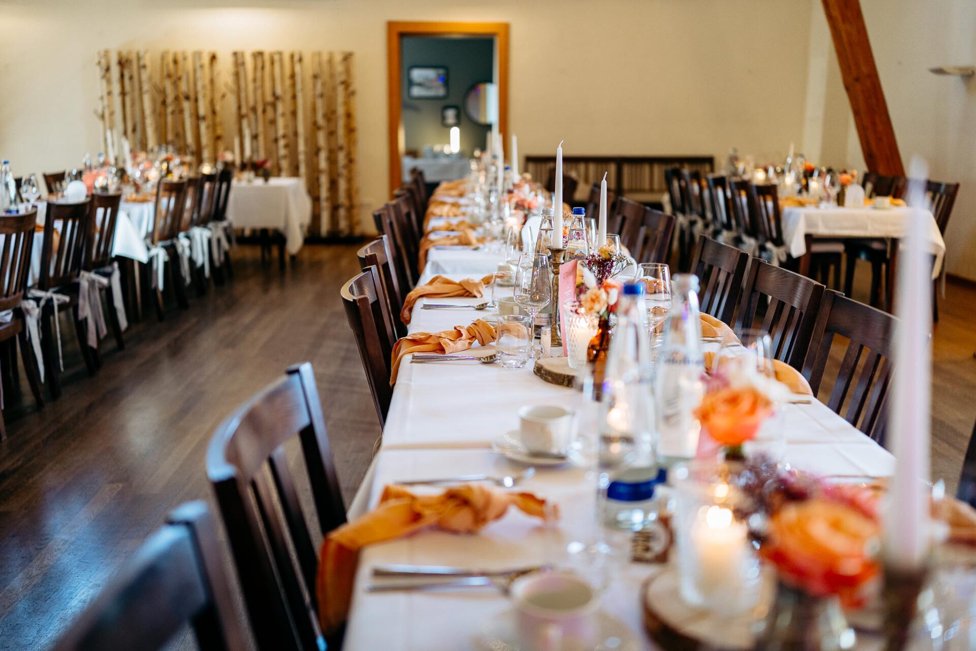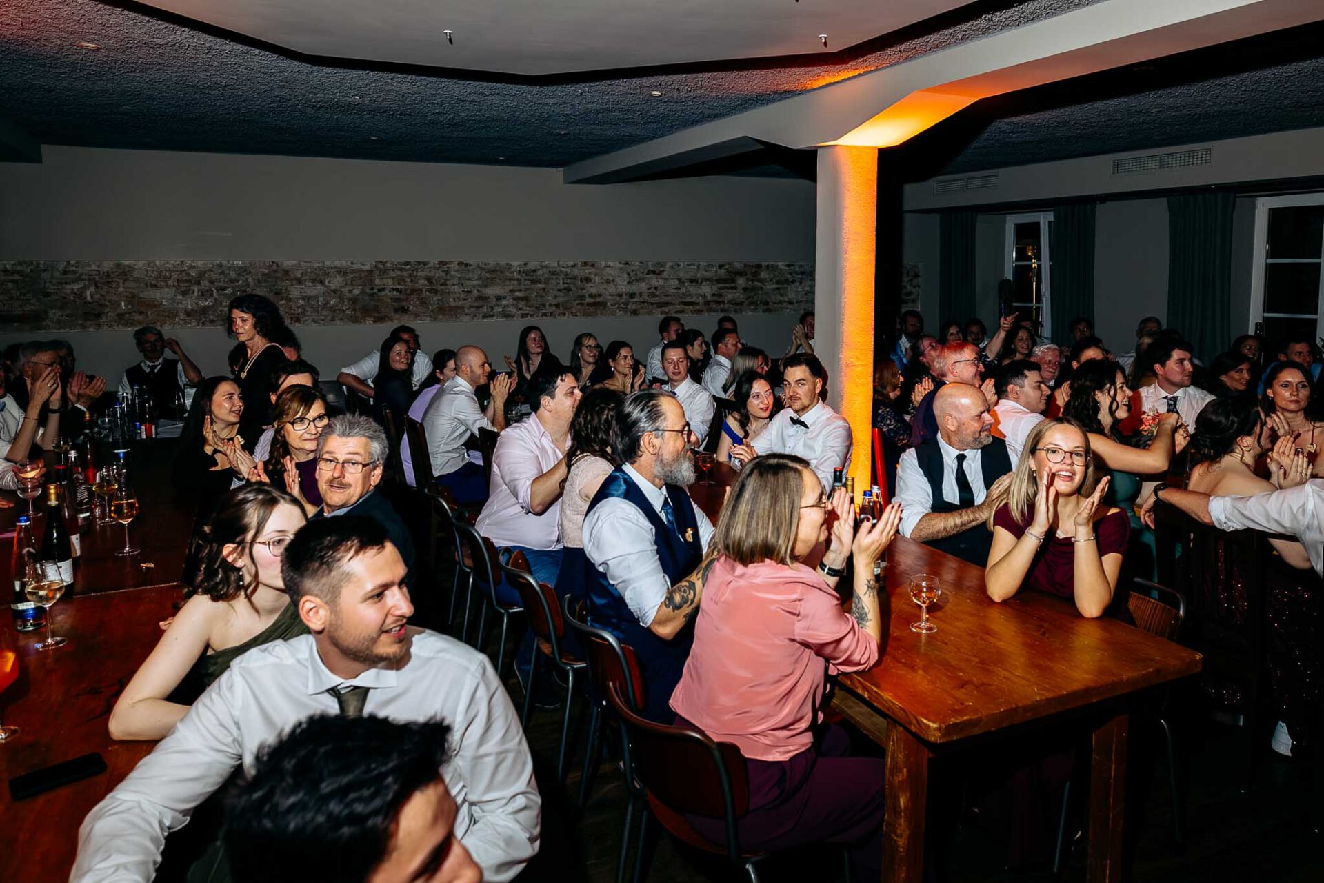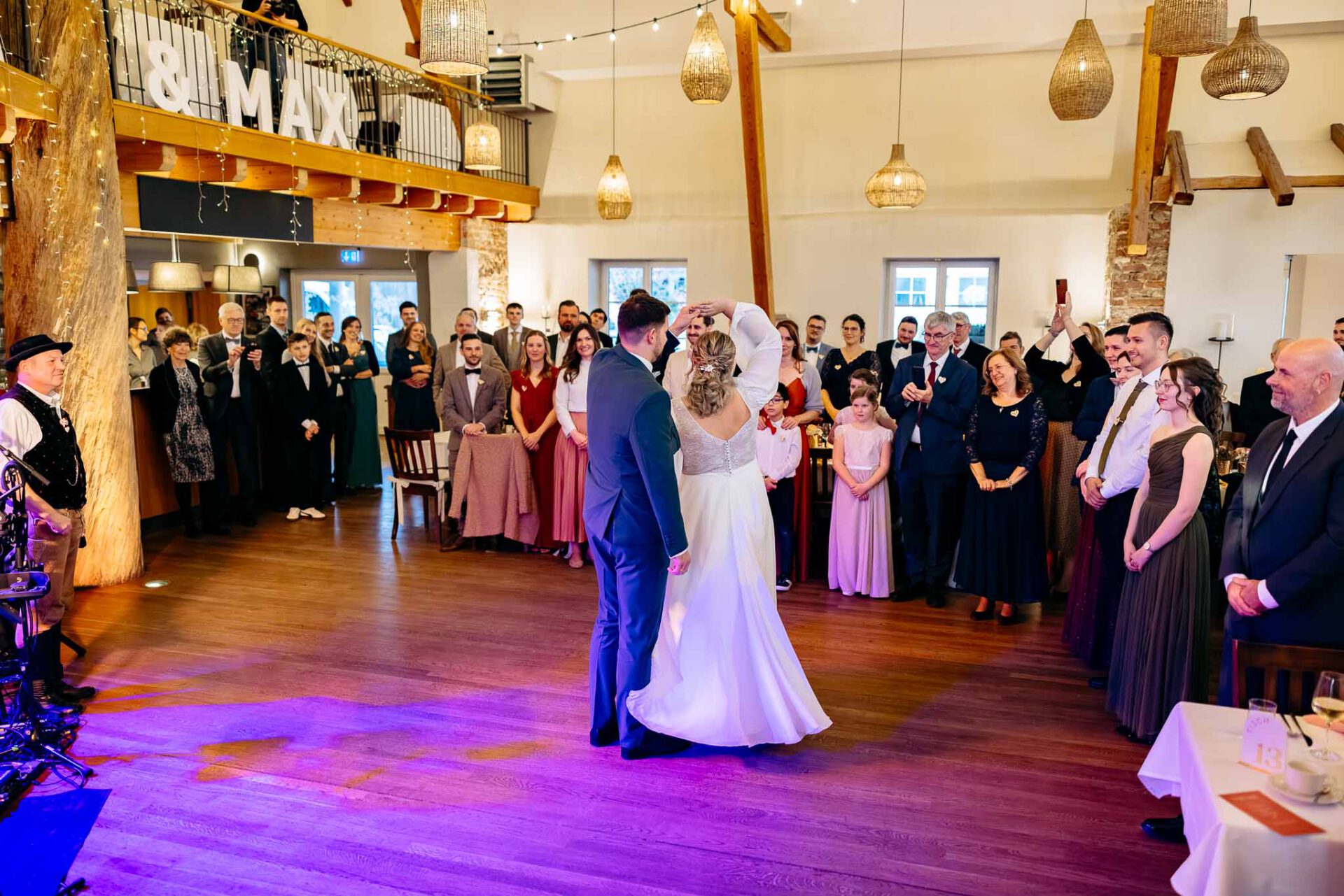 Der Saal bietet nicht nur ausreichend Platz für eure Hochzeitsgesellschaft, sondern auch eine moderne Empore, die sich hervorragend für eine Fotobox oder einen DJ eignet. Überdies sorgt die professionelle Lichttechnik für die richtige Stimmung auf der Tanzfläche. Das Brautpaar, das wir begleiten durften, hatte die Hochzeitsband „Vis-á-Vis“ engagiert – eine Band, die definitiv das Potenzial hat, eure Gäste zum Tanzen zu bringen und die Stimmung zum Kochen zu bringen.