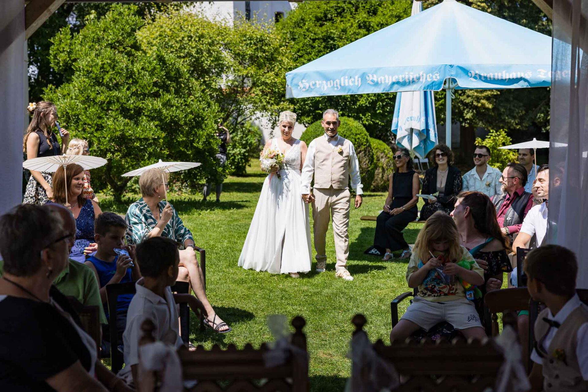 Was den Pfarrhof in Unterbrunn so besonders macht, ist die standesamtliche Trauung im Außenbereich. Der Pavillon im großen Garten vermittelt nämlich das authentische Gefühl einer freien Trauung unter freiem Himmel. Darüber hinaus habt ihr hier die Möglichkeit, eure Zeremonie mit eigenen Wünschen und Ideen mitzugestalten – was bei vielen Standesämtern nicht selbstverständlich ist.