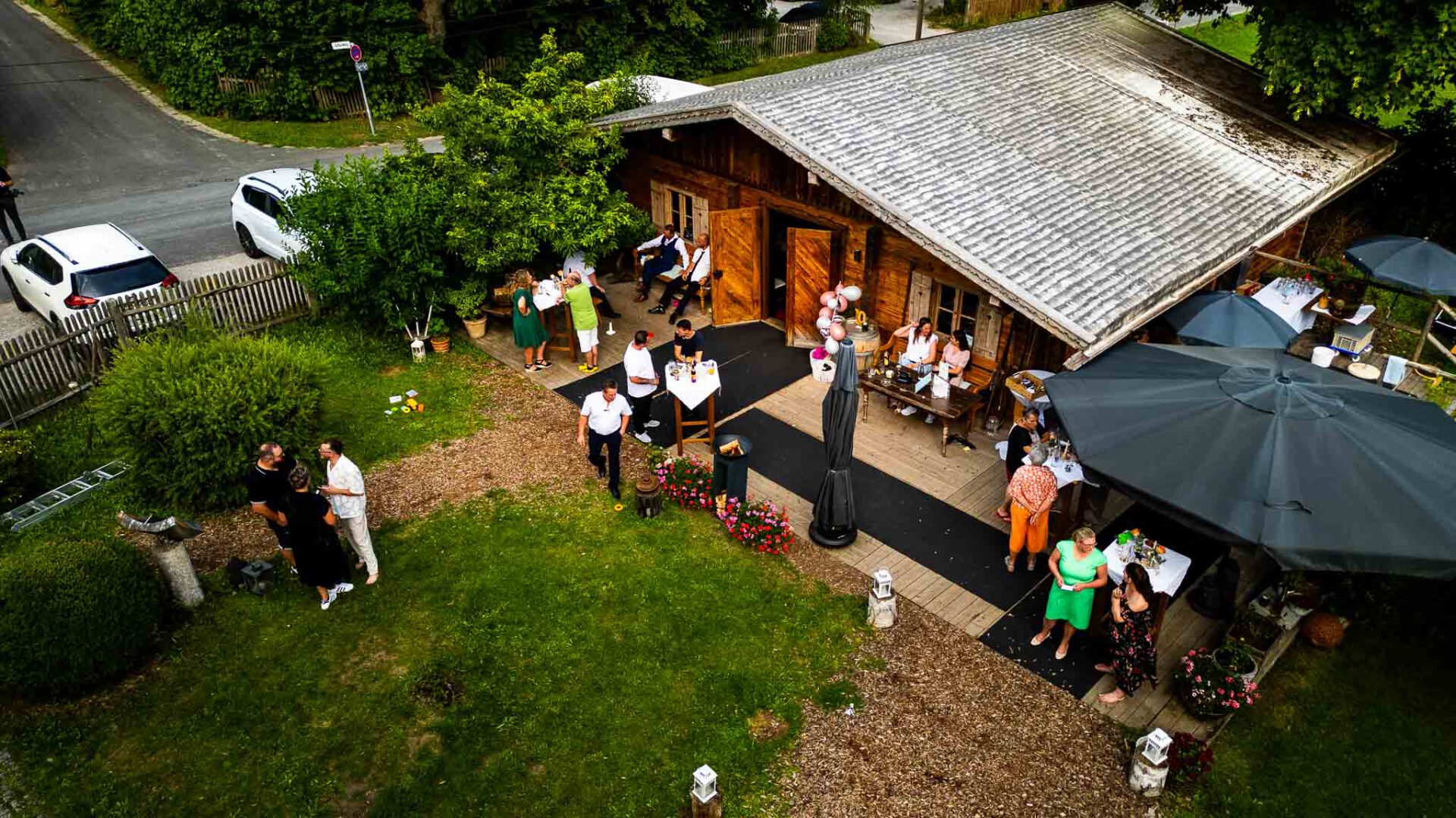 Direkt auf dem Gelände des Pfarrhofs findet ihr eine charmante Blockhütte im rustikalen Stil, die Platz für etwa 60 bis 80 Personen bietet. Zwar wird die Tanzfläche dann schon etwas gemütlicher, aber dafür habt ihr den riesigen Vorteil, dass Trauung und Feier am selben Ort stattfinden können. Als Hochzeitsfotograf Gauting schätzen wir dieses Konzept besonders, denn dadurch spart ihr Fahrzeit und habt super viel Zeit mit euren Gästen.