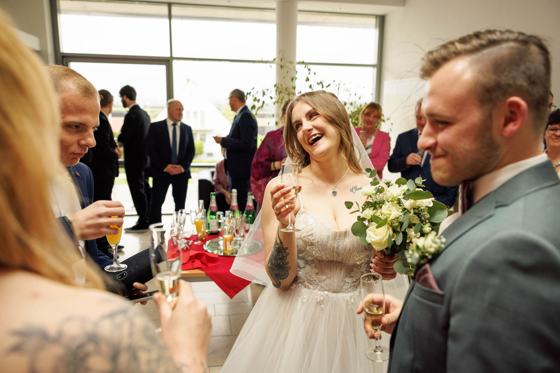 Der großzügige Vorraum im Gebäude ist übrigens perfekt für einen ersten Sektempfang geeignet, bevor ihr euch auf den Weg zur Feier macht. So habt ihr die Möglichkeit, direkt nach der Trauung mit euren Gästen anzustoßen und erste Glückwünsche entgegenzunehmen – unabhängig vom Wetter draußen.