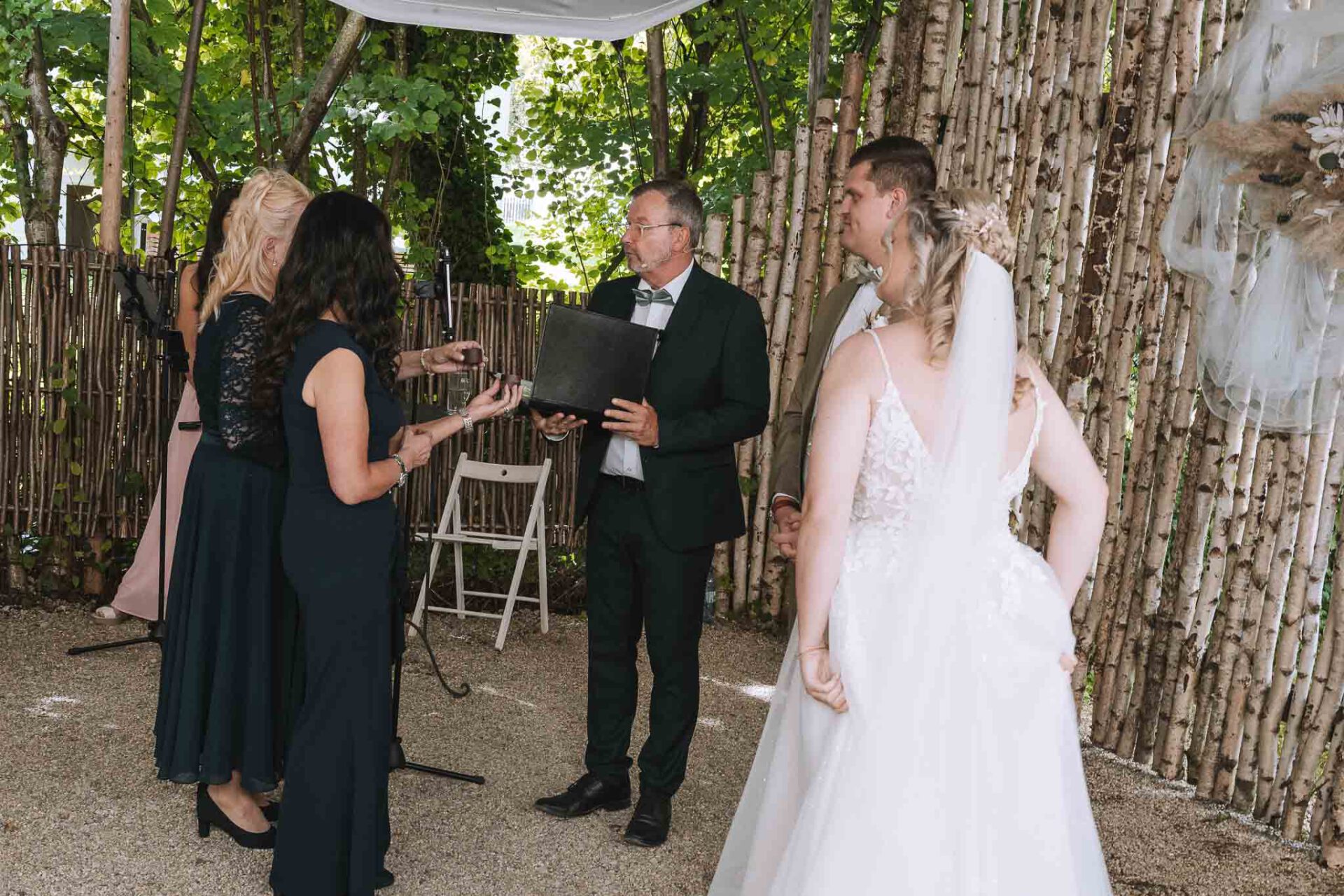 Was Roland zusätzlich auszeichnet, ist seine gründliche Vorbereitung. Er verschickte Fragebögen an unsere Trauzeugen und Familienmitglieder, um noch mehr Details über uns zu erfahren – auch Geschichten, die wir selbst vielleicht nicht mehr auf dem Schirm hatten. Diese Informationen hat er dann gekonnt in seine Rede eingewoben, sodass unsere freie Trauung nicht nur emotional, sondern auch sehr persönlich und authentisch wurde. Zudem gab es viele Lacher, die die Zeremonie auflockerten und für eine perfekte Stimmung sorgten. Als Hochzeitsfotograf Ingolstadt wissen wir, wie wichtig diese Balance ist.